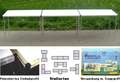 Besondere Stabilität ergibt sich durch das einzigartige, praktische, patentierte, Einhak-Keil-Profil, das es Ihnen ermöglicht, die Tische in jeder beliebigen Position ineinander einzuhaken (längs oder auch quer) Dies ermöglicht Ihnen unzählige Stell-Kombinationen!